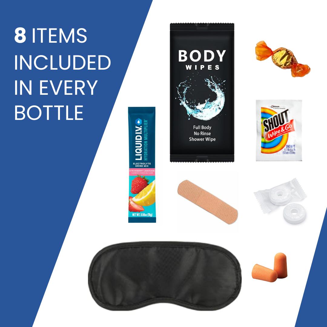 Cada kit viene en una botella grande, reutilizable y estilo receta, etiquetada con nuestro diseño exclusivo "Kit de recuperación de la resaca" e incluye: